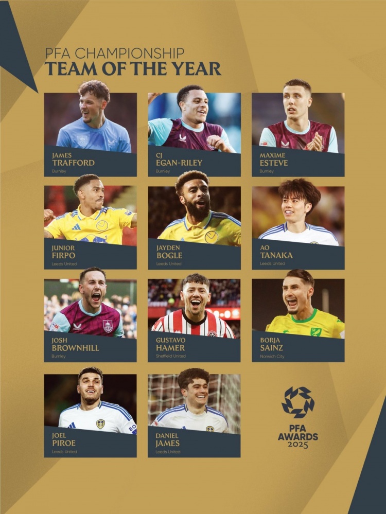 8月20日,PFA年度颁奖典礼于昨日顺利举行。典礼上揭晓了由职业足球运动员投票选出的2024/25赛季英冠联赛最佳阵容,效力于利兹联的日本国脚田中碧成功入选。
