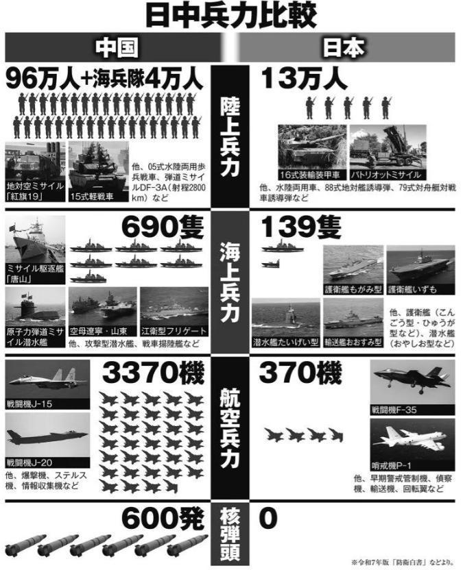 在空中力量方面,中国被标注为拥有超过3300架军机,而日本则不足400架。