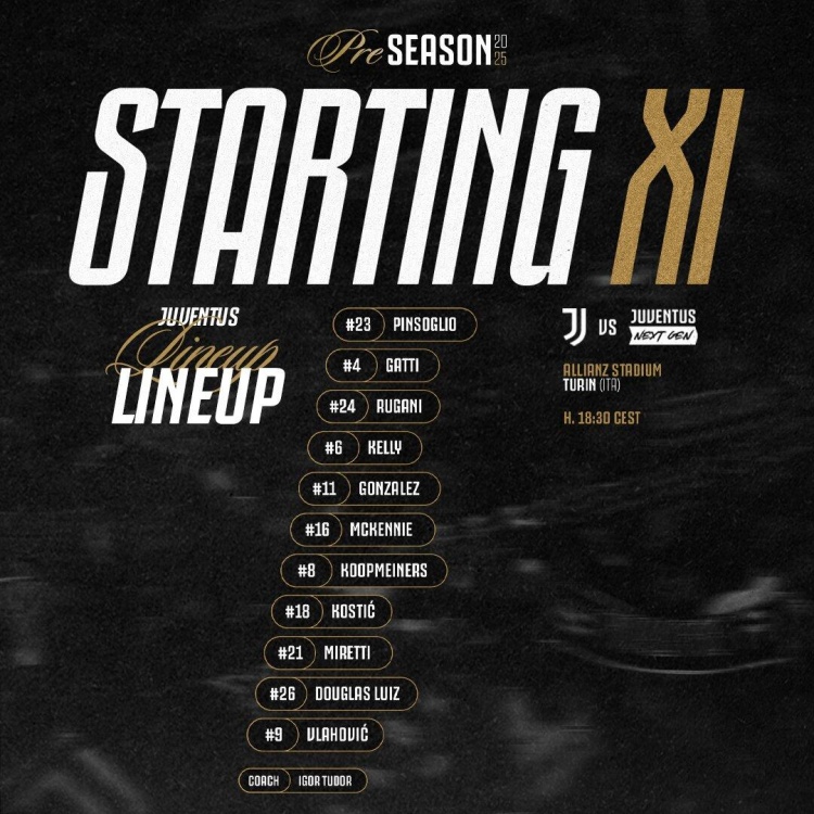 尤文一线队先发:门将平索里奥(23号),后防线由加蒂(4号)、凯利(6号)、鲁加尼(24号)组成,中场配置包括库普梅纳斯(8号)、麦肯尼(16号)、米雷蒂(21号)和道格拉斯-路易斯(26号),锋线则由弗拉霍维奇(9号)搭档尼古拉斯-冈萨雷斯(11号),科斯蒂奇(18号)出任边路