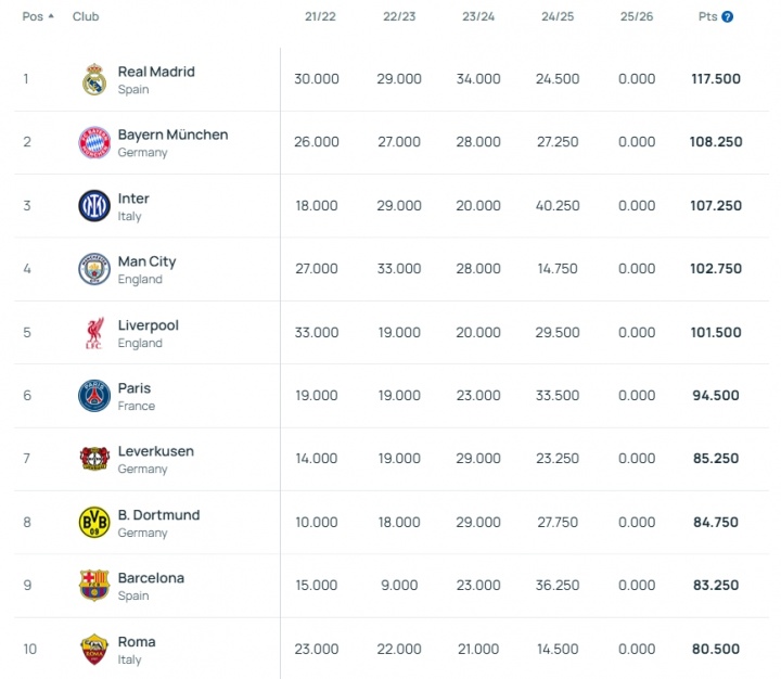 ⚡欧足联俱乐部排名更新:皇马拜仁国米领跑,曼城下滑一位,英超三强位居中游
