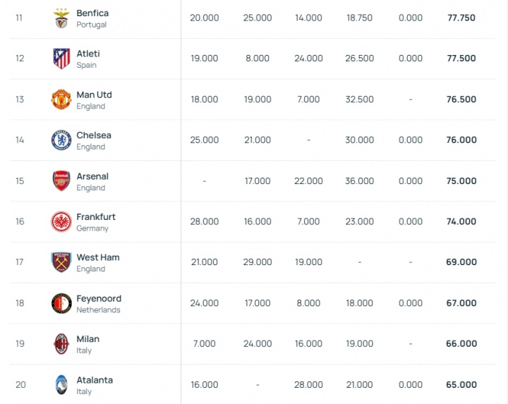11-20位依次为:本菲卡、马德里竞技、曼联、切尔西、阿森纳、法兰克福、西汉姆联、费耶诺德、AC米兰、亚特兰大